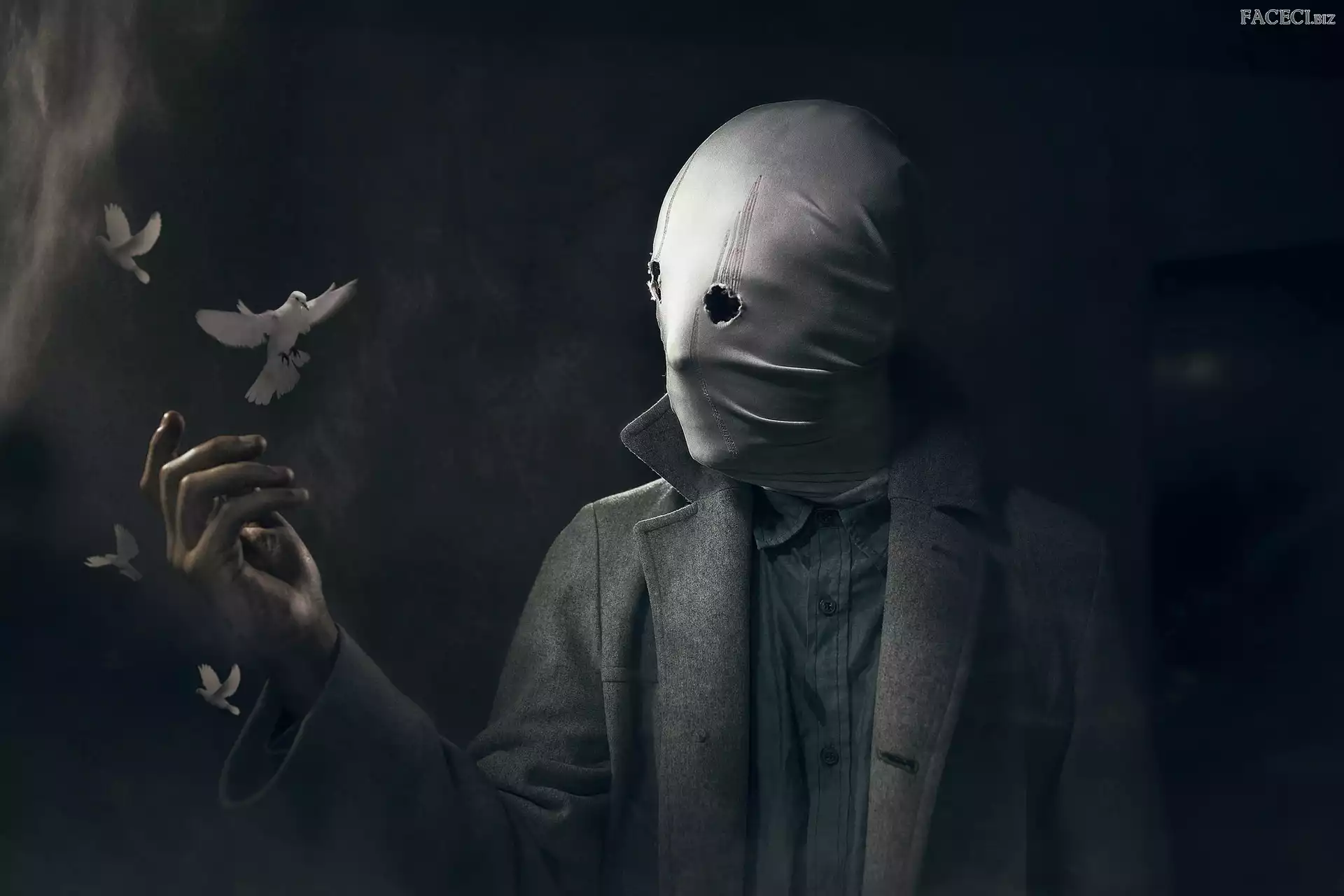 Tło czarne, Gołębie, Maska, Człowiek, Ptaki - faceci.biz